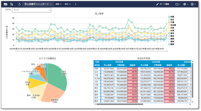 ・売上推移チャートのデータポイントをクリックすることでカテゴリ別構成比チャートのデータを絞り込む検索機能