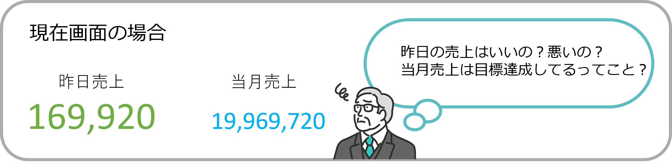 現在の画面だと、サイズの違いから『昨日売上』にまず視線が向きますが、その色に対する良し悪しがわかりません。さらに、色に対する情報も読み取れないため、この情報に対してどういった理解をしたらいいのかわからなくなってしまうのです。