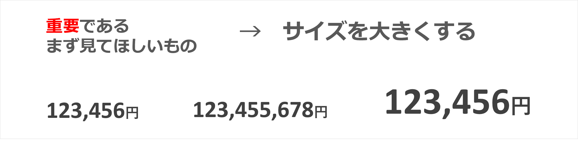 サイズや色に差をつけるときは、以下のような気付きを促すときに有効な表現方法です。