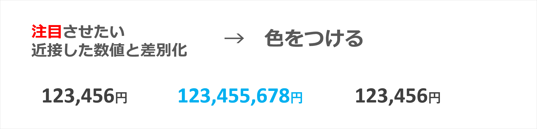 売り上げ数値の色やサイズを変えて表示させていますが、色やサイズの変動などを使った表現をするときには、その違いに対する理由があるかどうかが重要です。