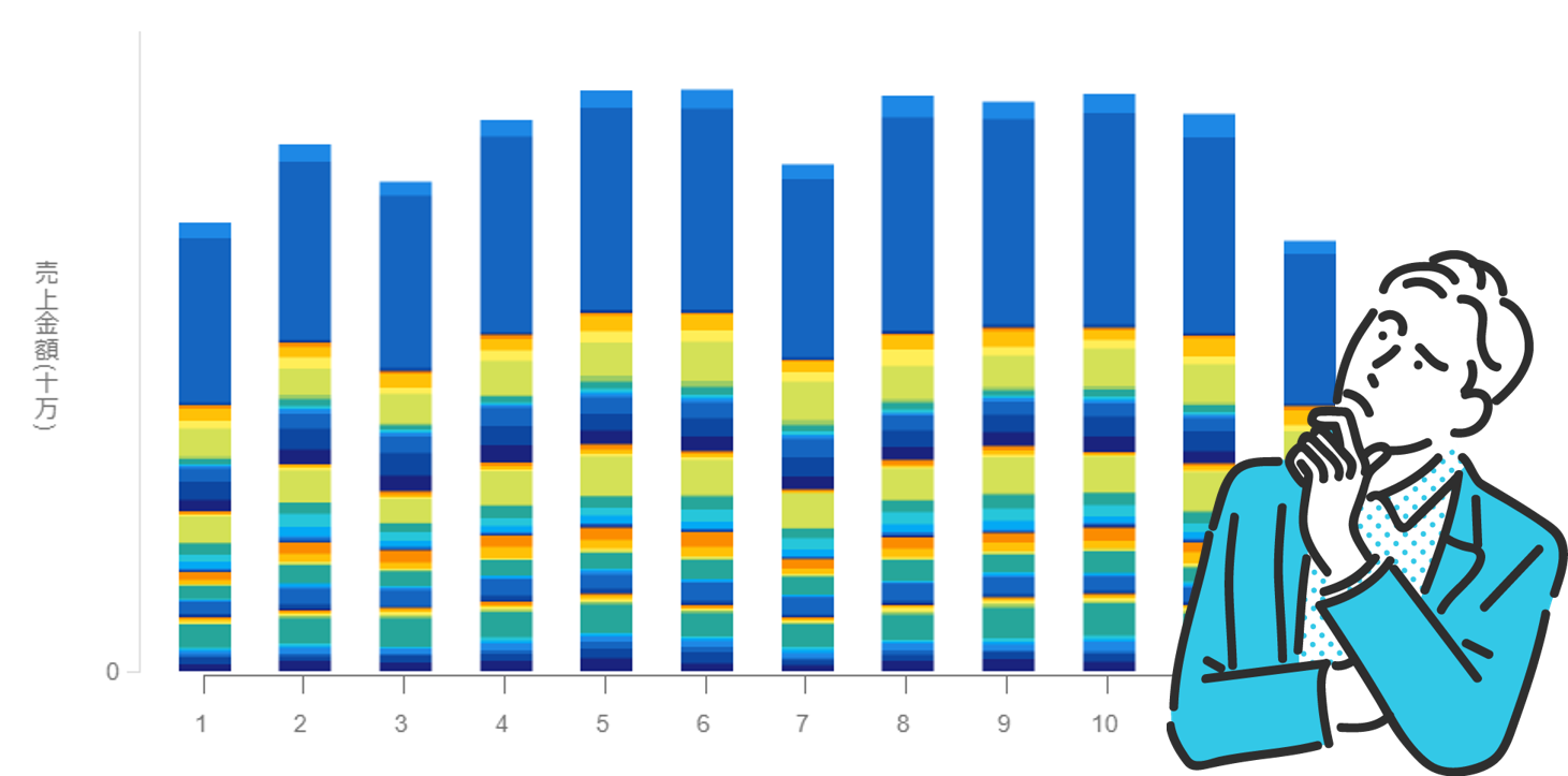 現状のままでは、大まかな売上状況は把握できるものの、先月との差を判断するためにはグラフをじっくり眺める必要があり、直感的に気付けませんね。