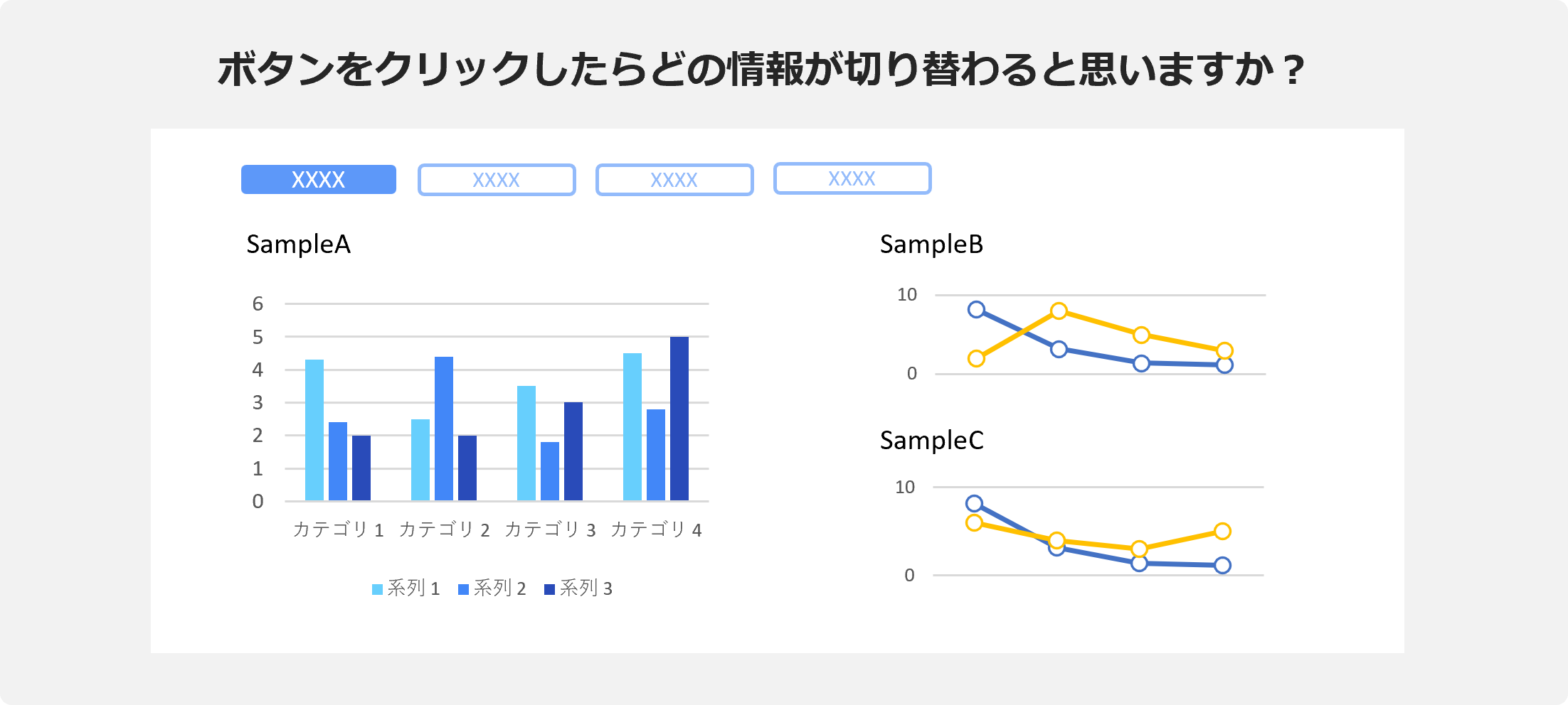 例えば以下のようにボタンが配置されていた場合、ボタンクリック後にどの情報が切り替わると予想しますか?