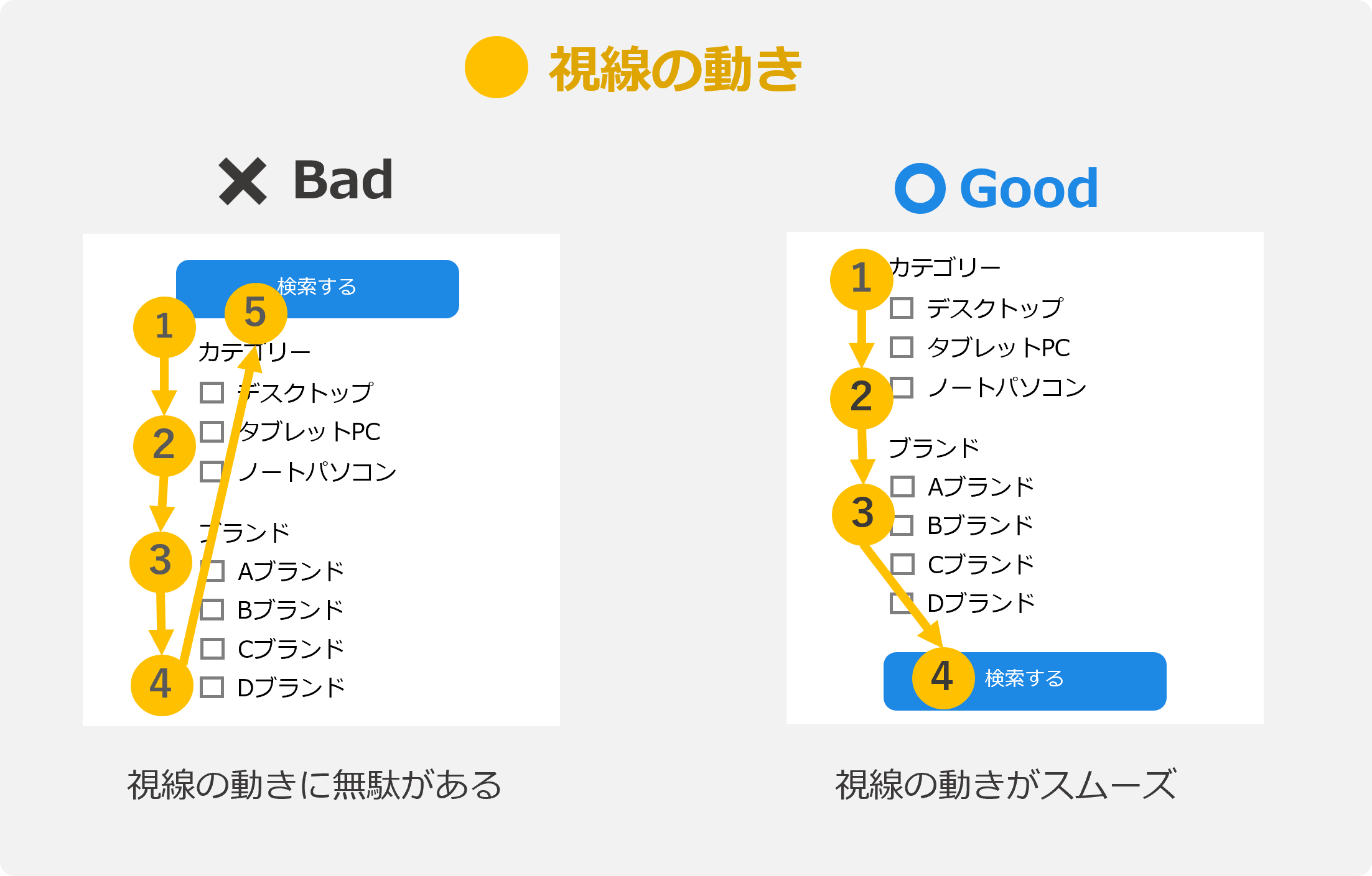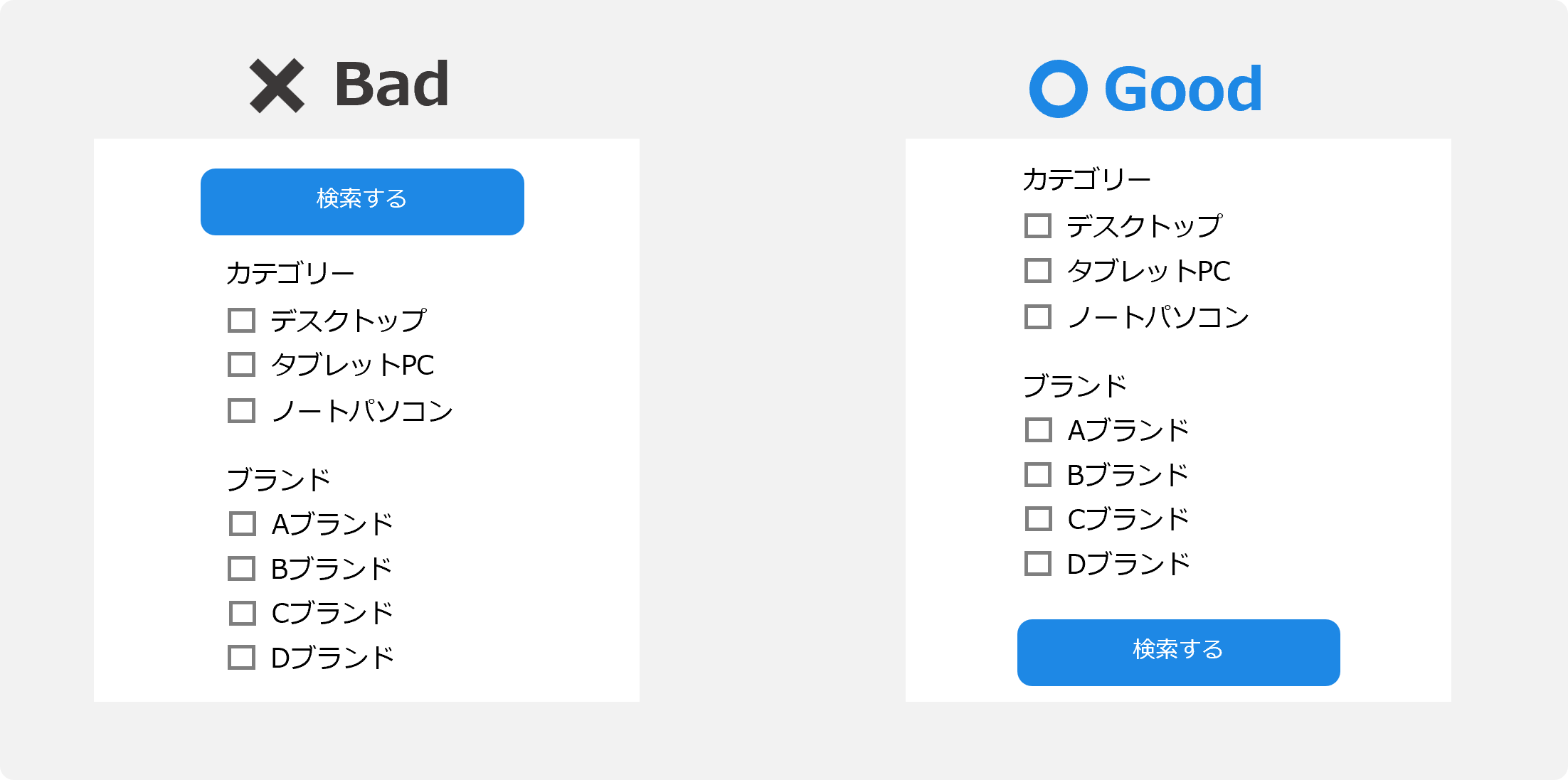 悪い例の場合、検索を実行するボタンが最上部にあります。この場合は、絞り込む内容を下まで読み終わった後に一番上まで視線を戻さなくてはなりません。