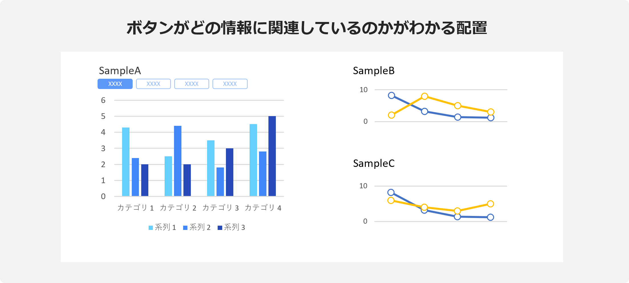 ボタンを利用してチャートを切り替える時、対象の情報のそばにボタンを配置します。ボタンをクリックするとどの情報がどう切り替わるのか理解しやすい配置を検討することが重要です。