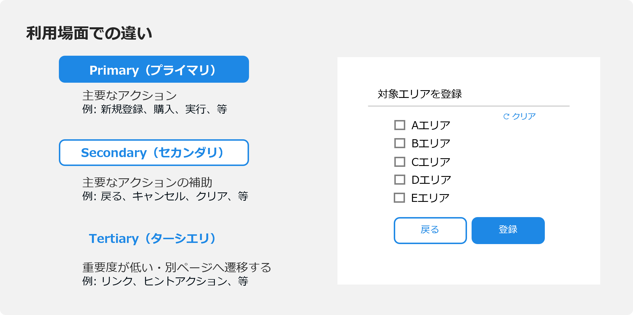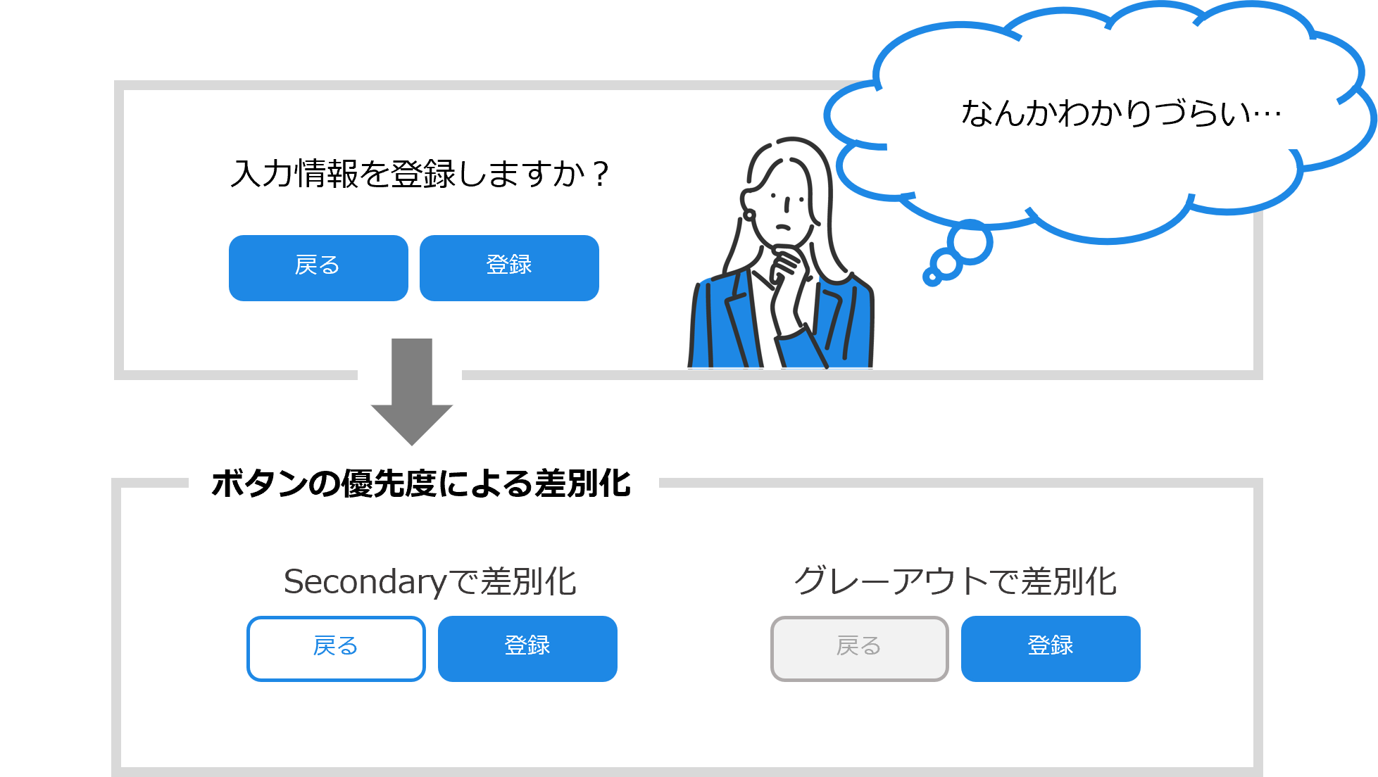 アクションとして『登録』と『戻る』があった場合、どちらもPrimaryのデザインで表現すると、ボタンの差別化ができず、どんなアクションをするためのボタンなのかが判断しづらくなってしまいます。