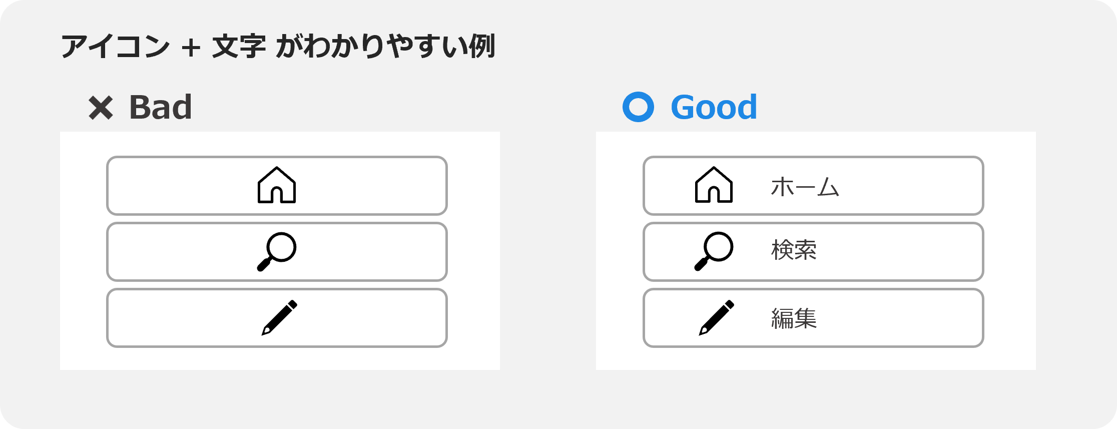 アイコンだけで理解できるか、文字を加えた方がわかりやすいかは配置する場所やボタンの意味を考えて決めなければなりません。
