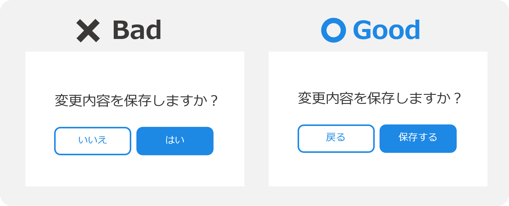 理想の行動としては、確認ダイアログの説明文「変更内容を保存しますか?」を一読してもらったあとにボタン操作を行ってほしいのですが、実際は補足文章として認識され、ダイレクトにボタンに視線を向けるユーザーが多いため、こういったボタンには「動詞」を使うことを推奨されているのです。