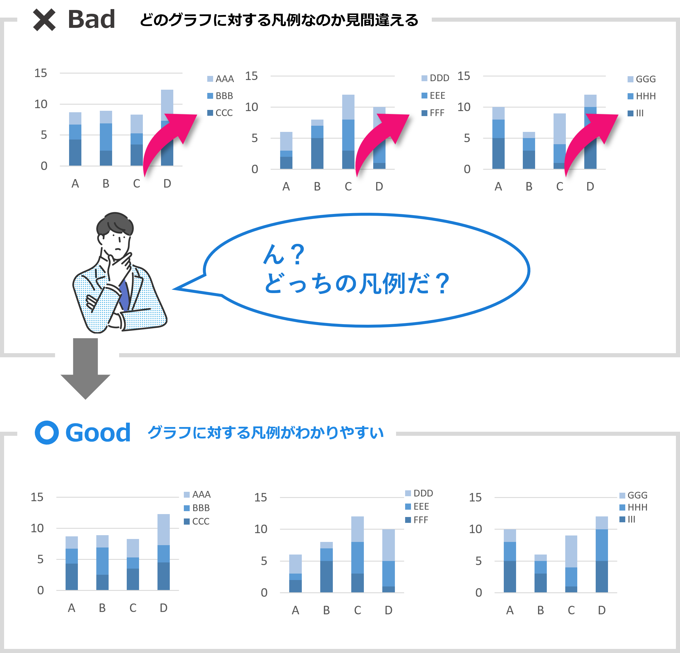 上記のように、グラフの表現手法がすべて違っていたり、タイトルデザインの統一感がないと利用者はパッと見たときに混乱してしまいます。