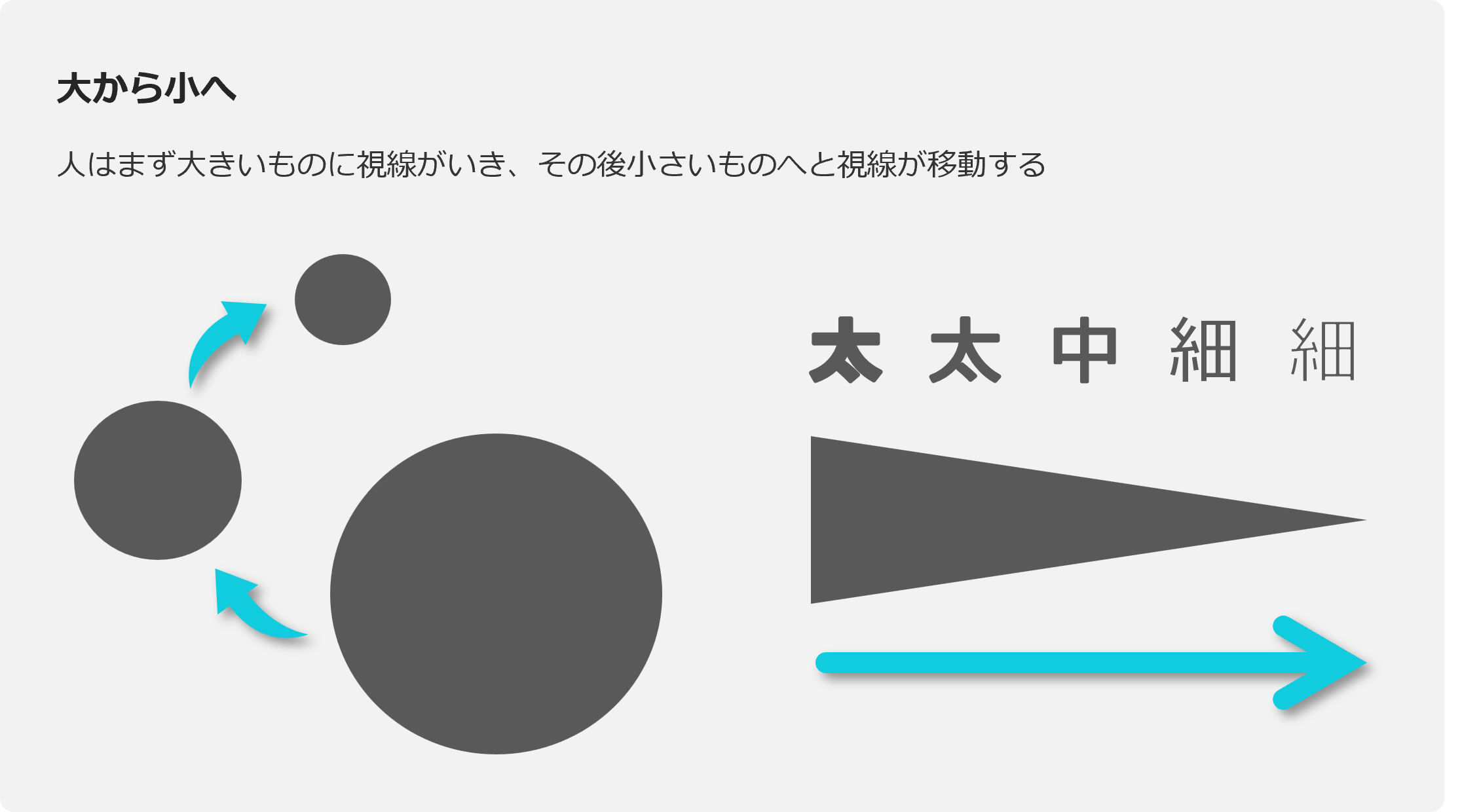 その性質を生かした手法が大から小へ視線を向けさせる誘導方法です。これは文字のサイズや太さにおいても同じことが言えます。