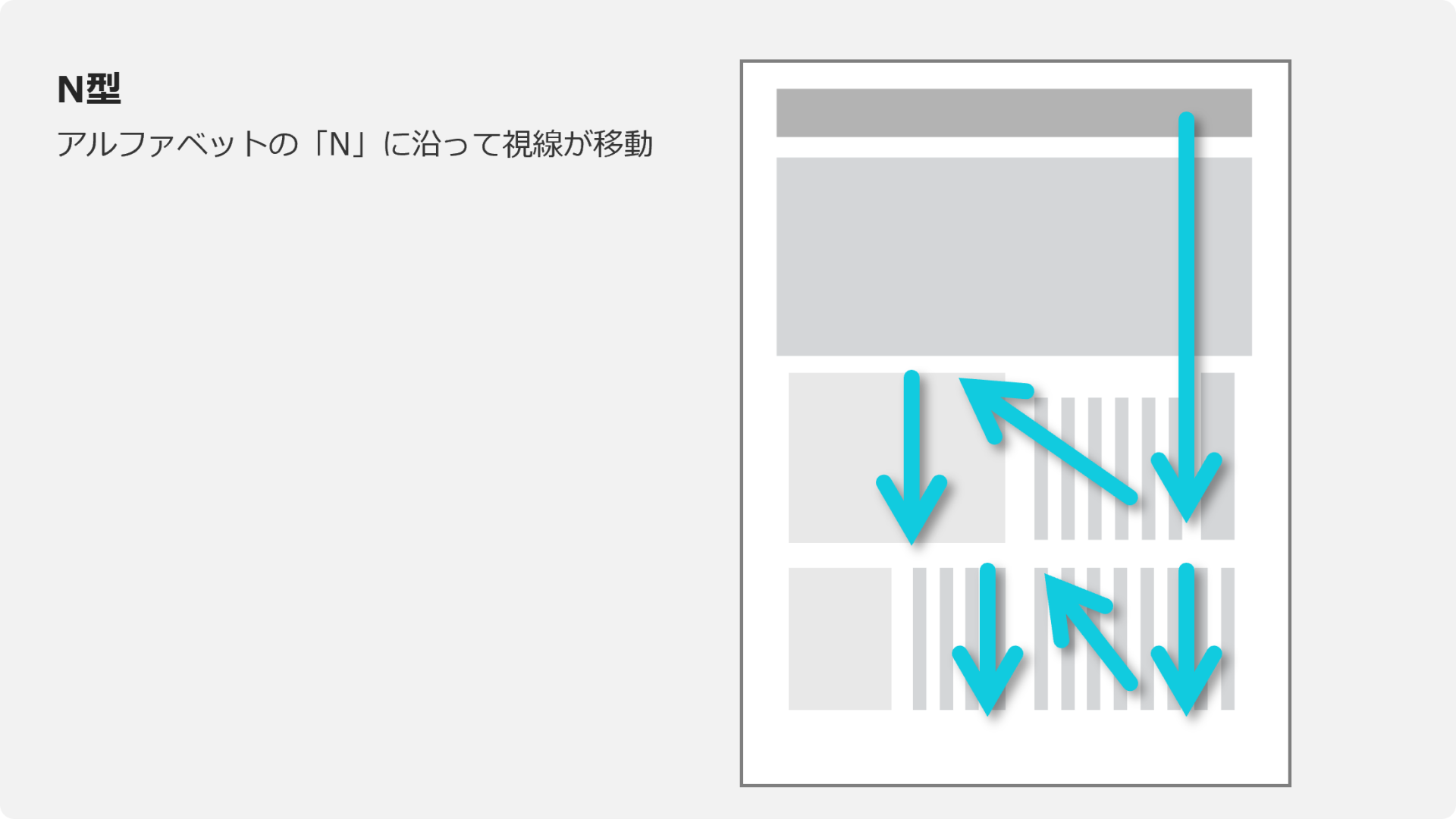 N型は、ユーザーの視線が右上から始まり、右下へ移動してから左上へ、最後に左下へと移動するパターンです。