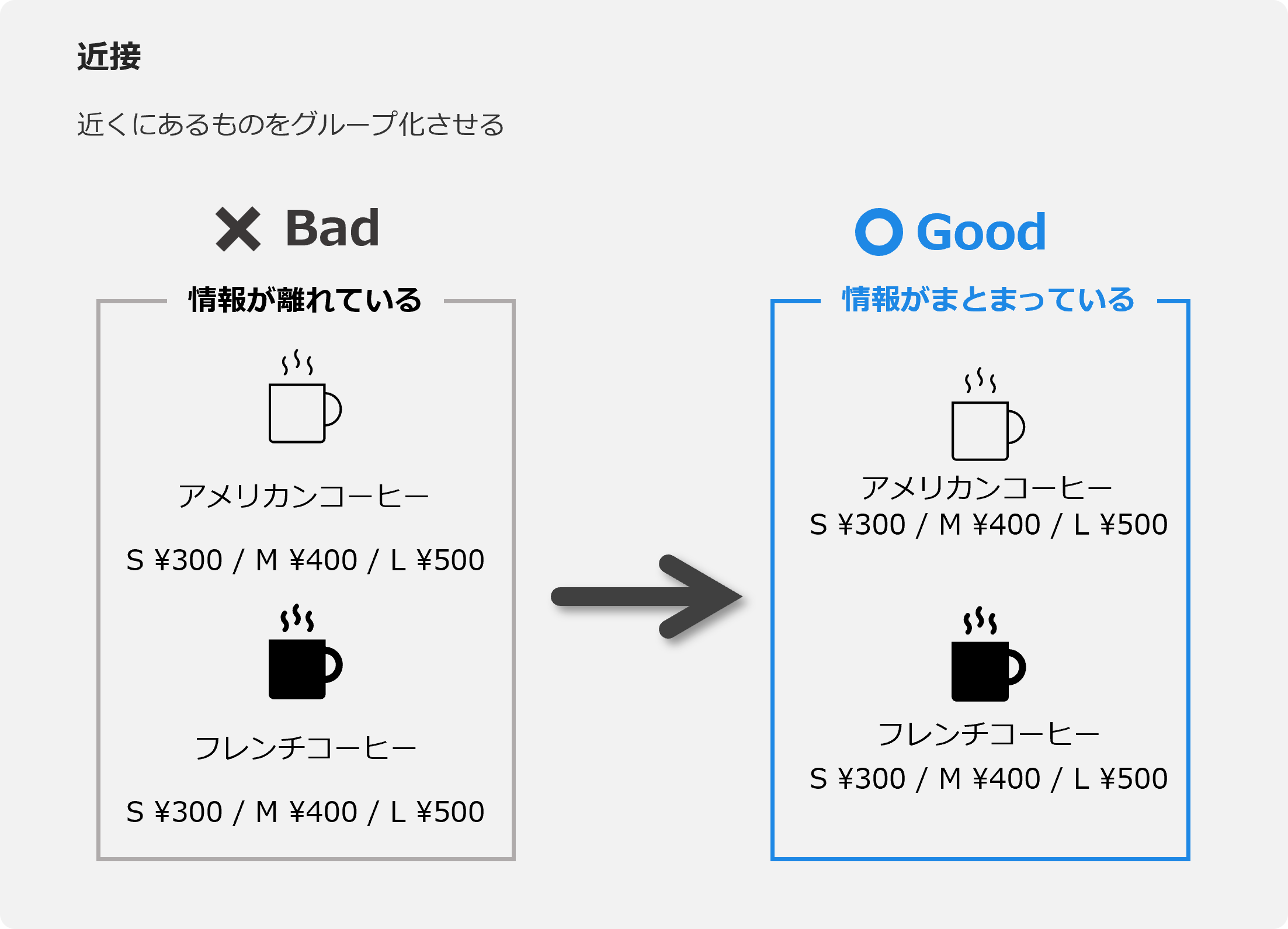 「Good」のように関連している情報は近接して配置するだけで、枠組みなどしなくても、情報をグルーピングして認識させることができます。