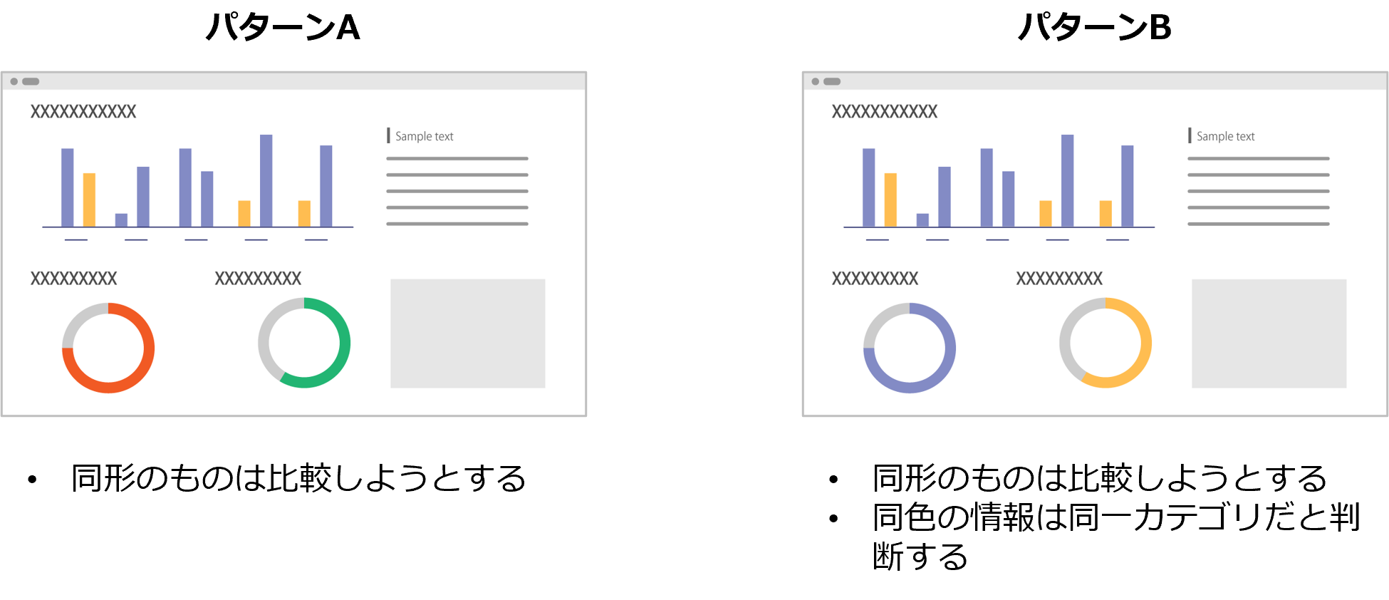例えば、下記のような2種類のダッシュボードがあった場合、同形の情報(円グラフ)は視線を動かして連続して確認させやすくなり、パターンBのように同色の情報とすることで縦棒グラフの情報と関連した内容だとひと目で判断させることができます。