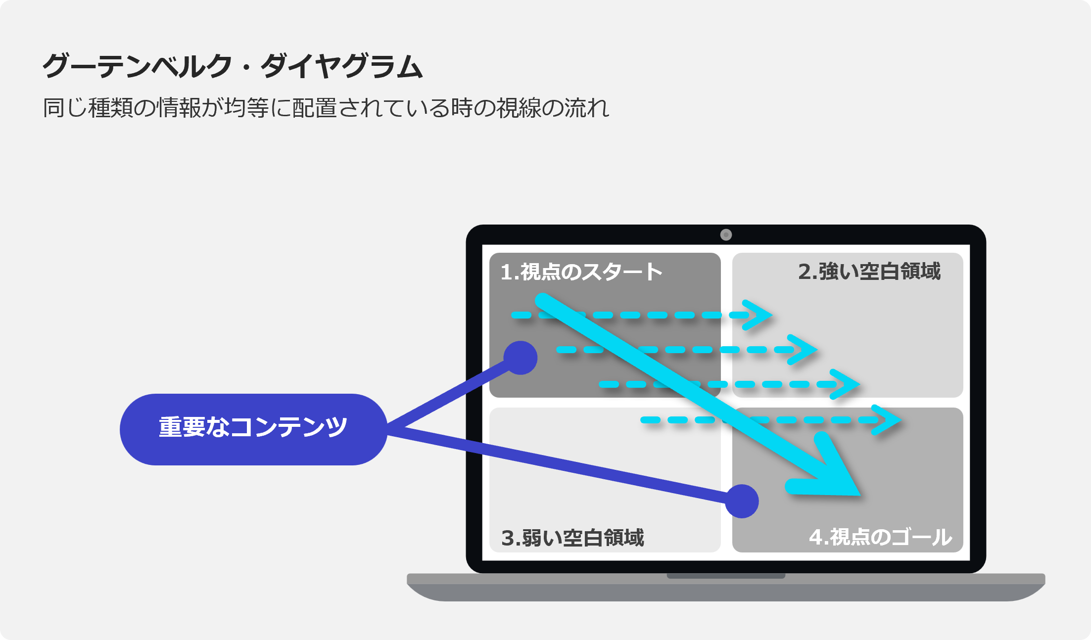 情報が均等に配置されている場合、視線は左上から斜め下方向に向かって移動する傾向があります。