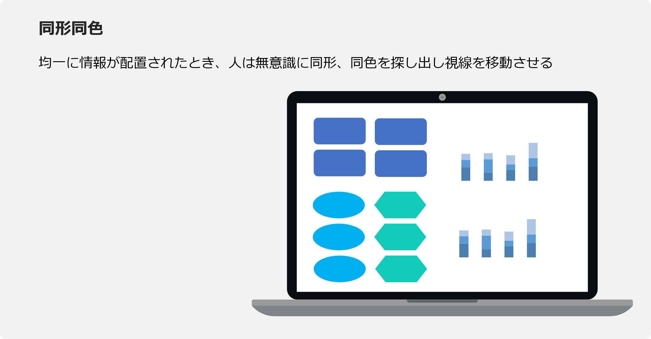 情報が均一に配置されている場合、人は無意識に形が同じ画像や同じ色の文字に視線を動かします。